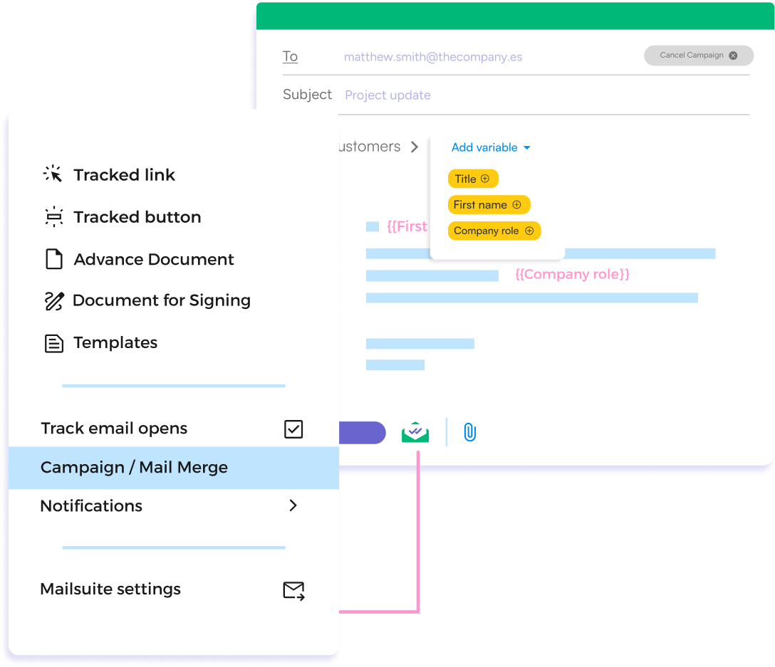 Personalized emails increase email engagement. Mailsuite lets you automatically add unlimited custom merge fields from Google Sheets.